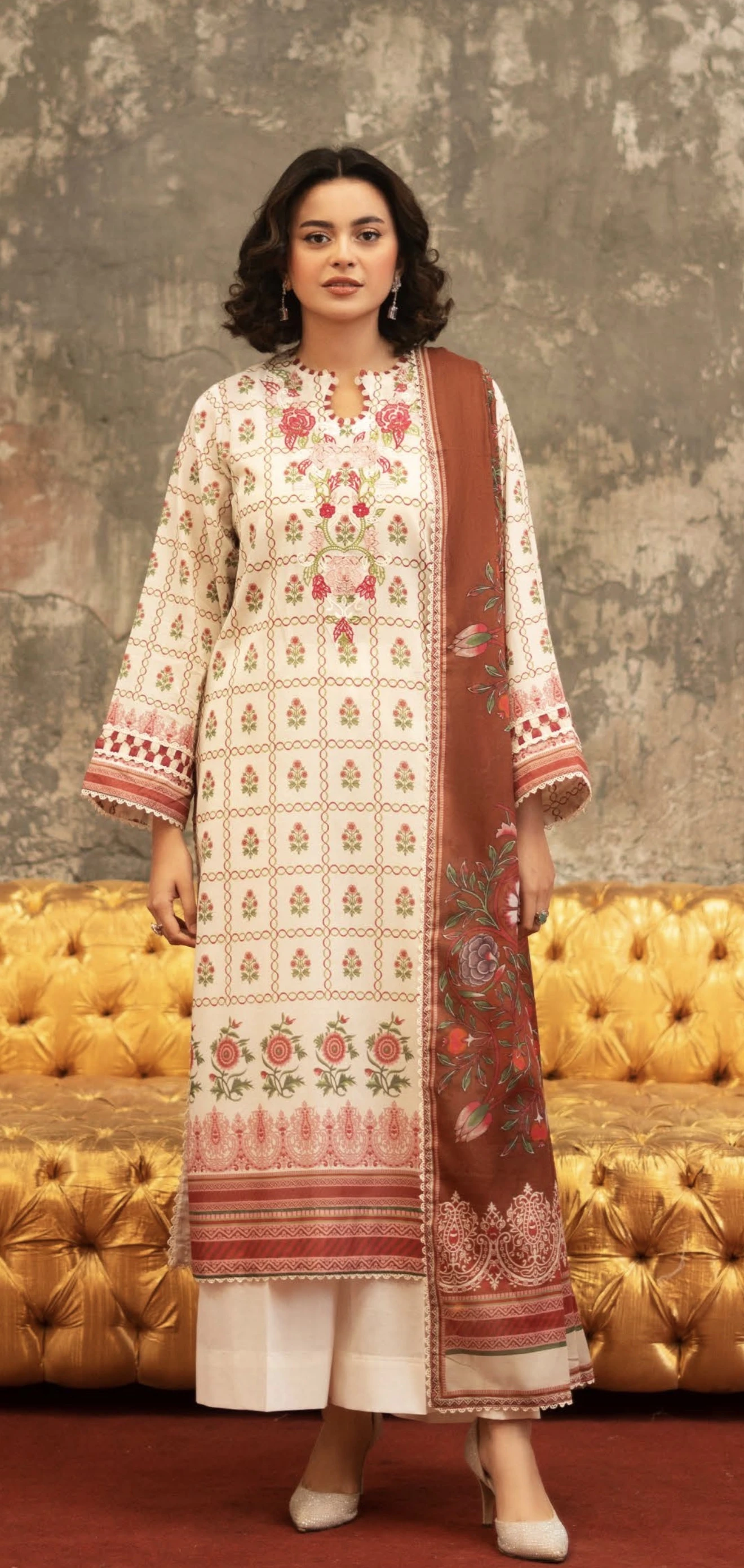 Front digital printed lawn neck embroidered